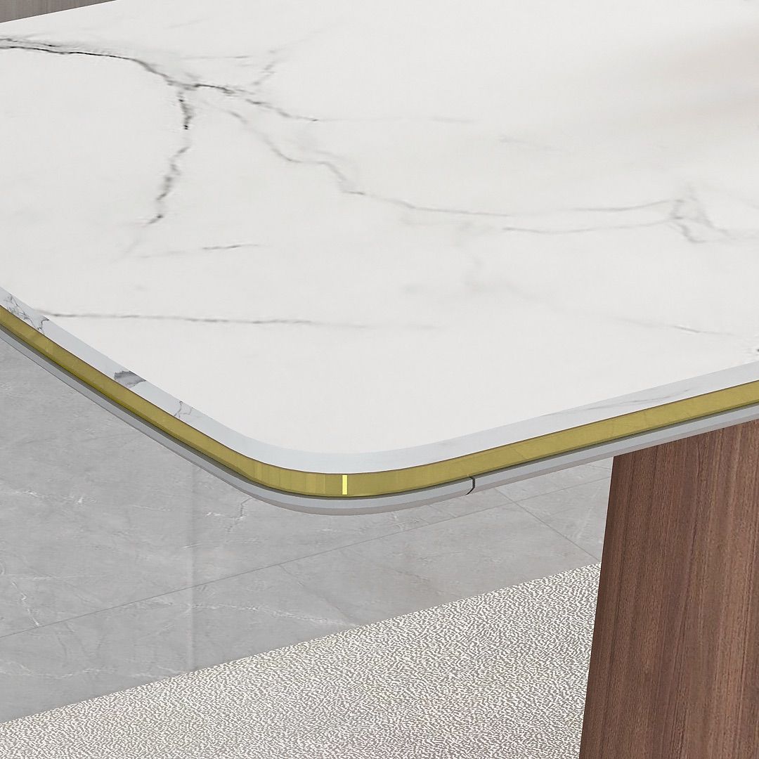 The tabletop is made from MDF finished with White Marble HPL, creating an elegant and easy-to-maintain surface. A gold accent detail around the table adds a refined visual highlight, giving the table a subtle sense of luxury while keeping a clean and modern appearance