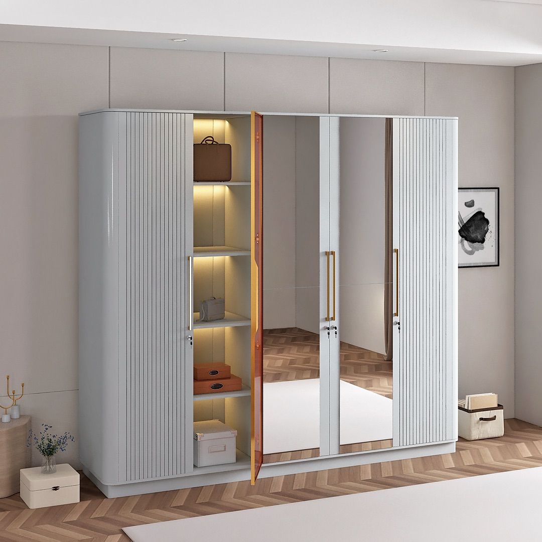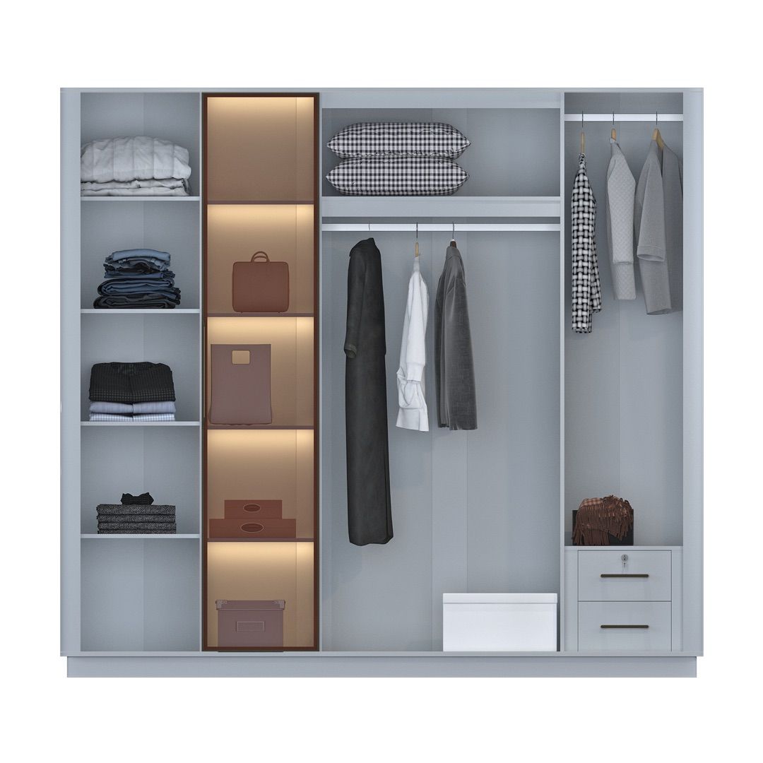 The Sunrise 5D SW wardrobe is made from MDF and HMR with a PVC sheet finish in Platinum Light Grey, creating a clean and bright appearance with a refined surface. The design is enhanced by a gold-finished aluminum frame, giving the wardrobe a structured and elegant presence.