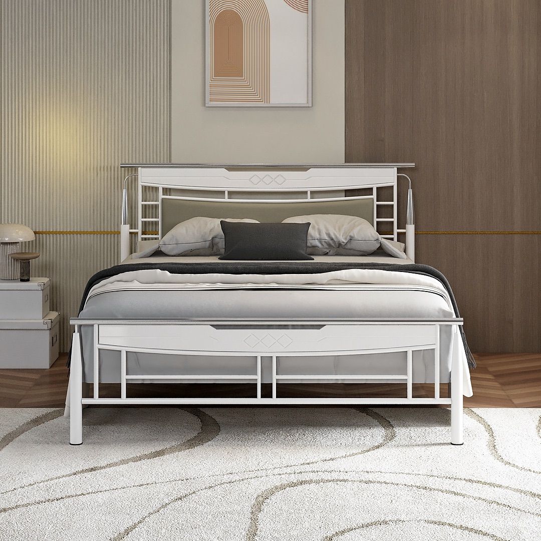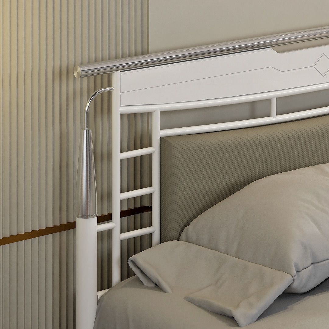 Bagian headboard dilengkapi bantalan dari spons yang dilapisi kain Oscar, menghadirkan kenyamanan sekaligus permukaan yang rapi. Elemen bantalan ini memperhalus karakter rangka besi tanpa mengurangi kesan bersih pada desainnya. Model ini tersedia dalam pilihan ukuran 120 cm, 140 cm, dan 160 cm, sehingga dapat disesuaikan dengan kebutuhan ruang tidur. Perpaduan rangka besi, panel berfinishing gloss, dan detail bantalan menghasilkan tempat tidur yang fungsional dan seimbang untuk penggunaan kamar tidur hunian.