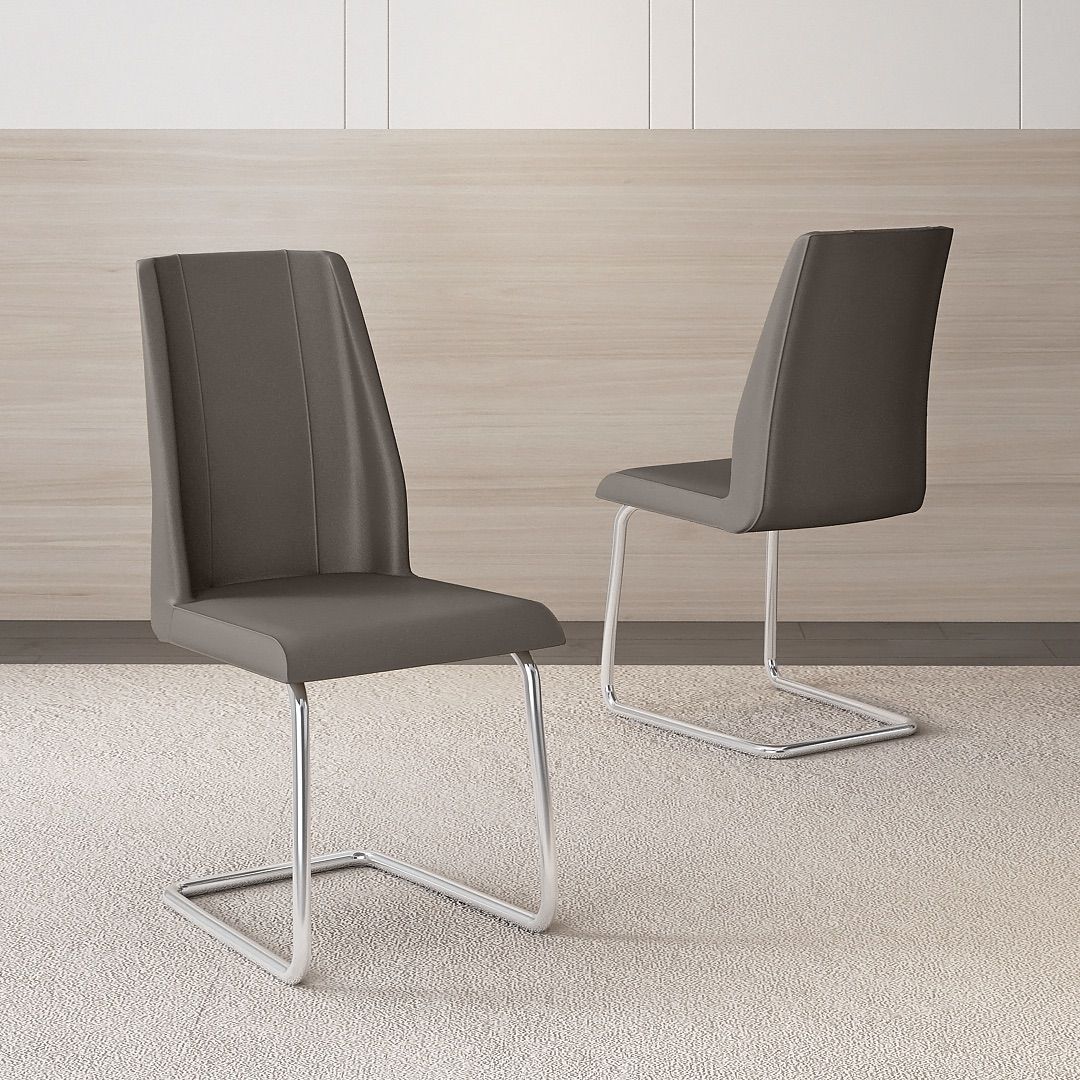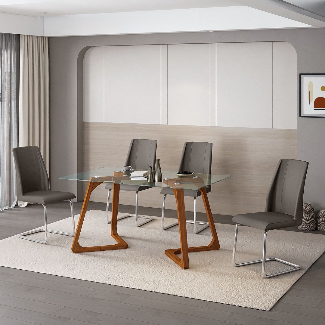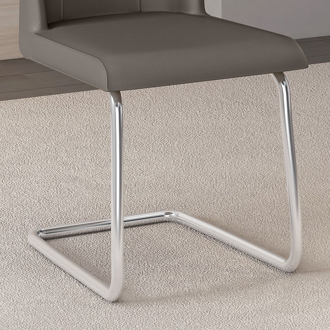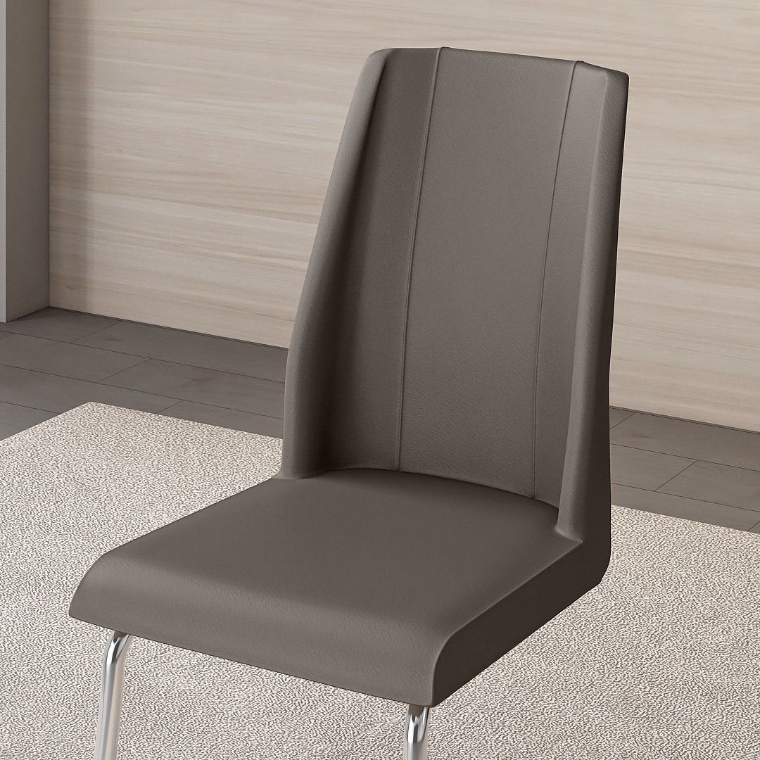 Kursi Makan Verona menggunakan rangka dari pipa besi dengan finishing chrome, membentuk struktur yang bersih dan teratur. Dudukan dan sandaran dibungkus kain oscar, menciptakan komposisi yang seimbang dengan rangka metalnya.