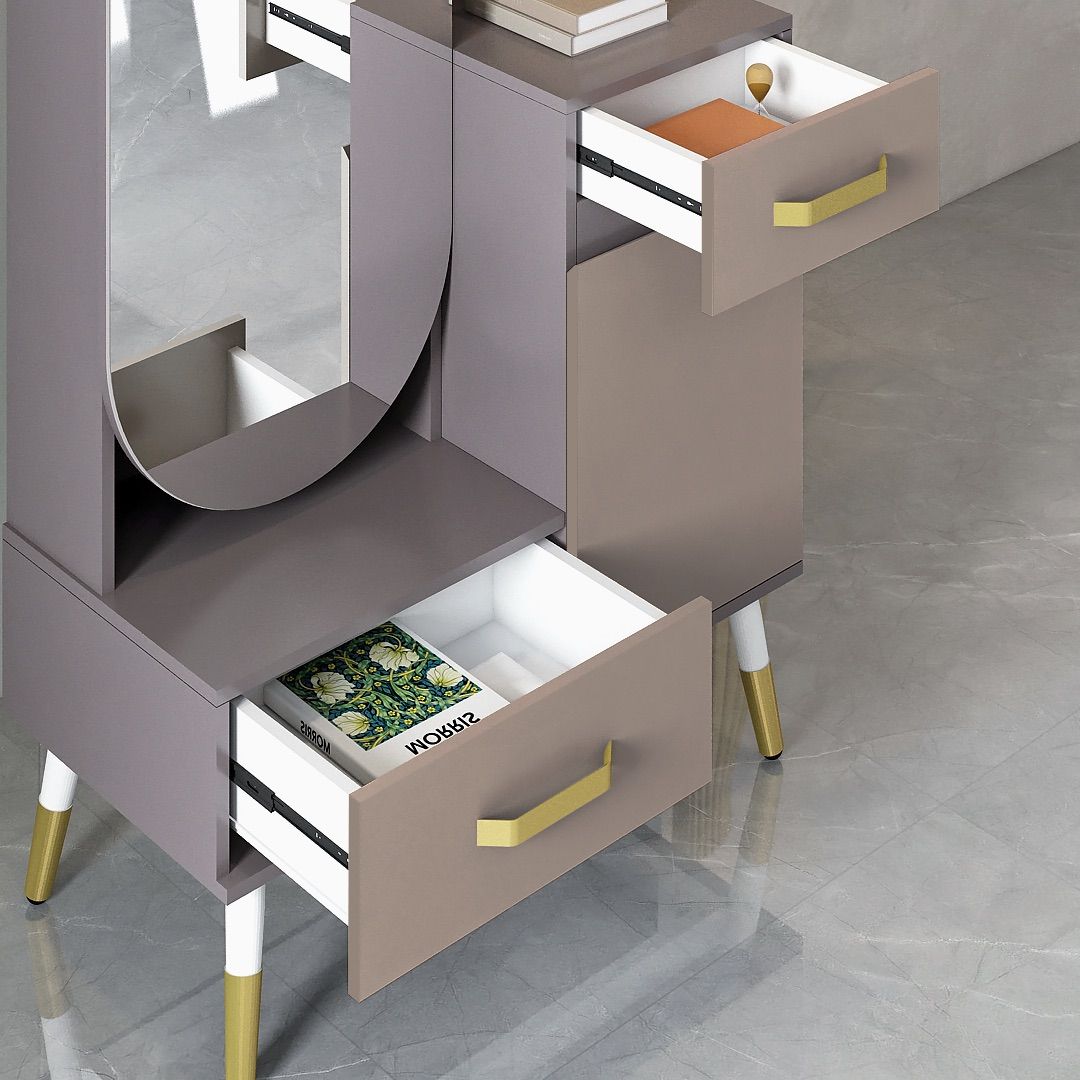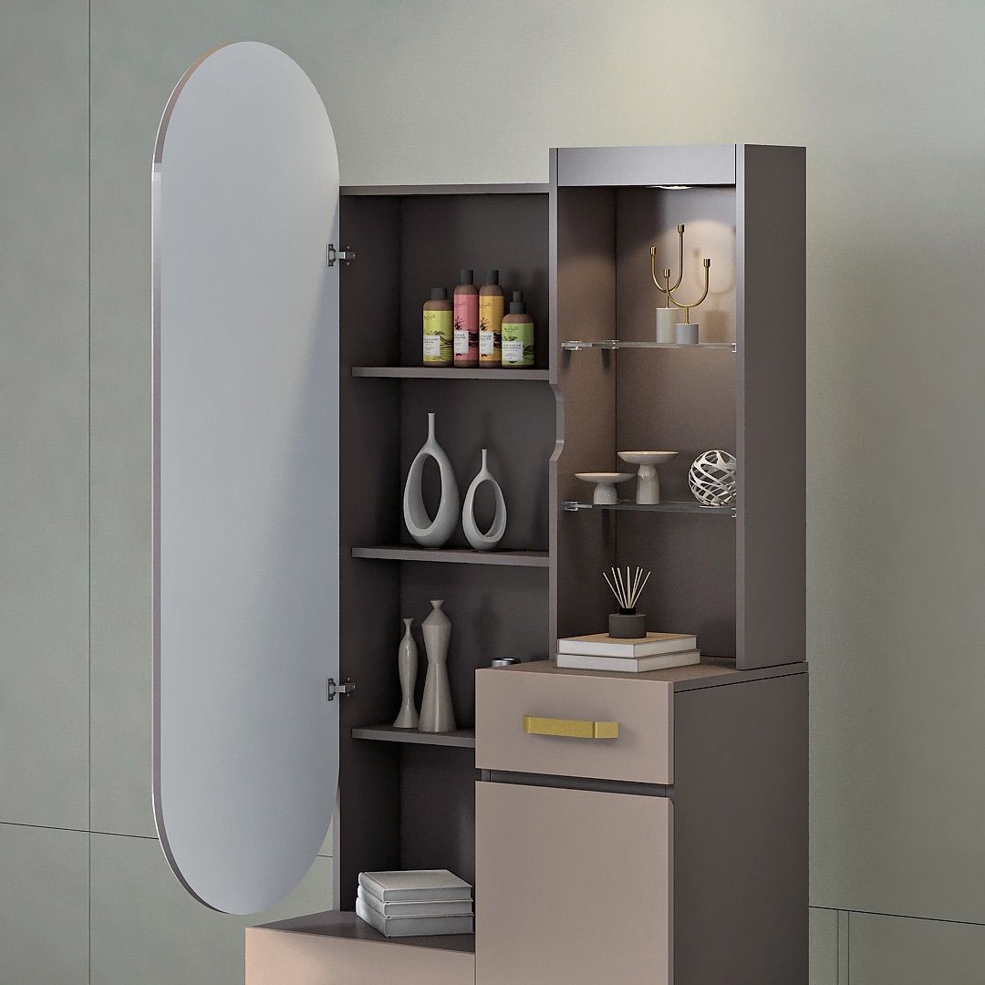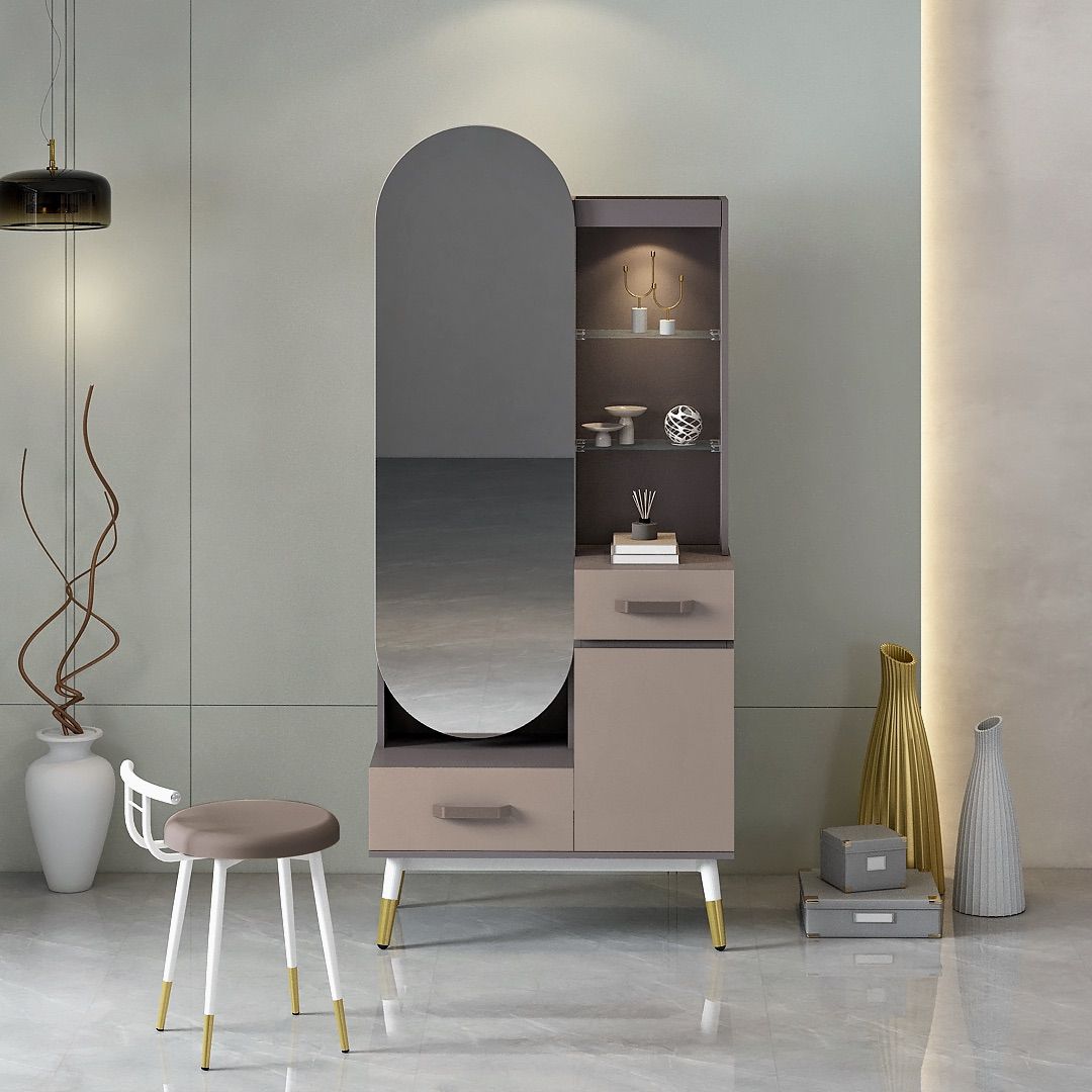 Bagian kaki menggunakan pipa besi dengan finishing powder coating warna putih, dilengkapi variasi aksen kaki besi berlapis coating warna emas yang menambah sentuhan elegan. Dresser ini juga dilengkapi dengan beberapa rak penyimpanan di bagian belakang cermin, memberikan fungsi tambahan untuk menyimpan perlengkapan secara rapi dan praktis.