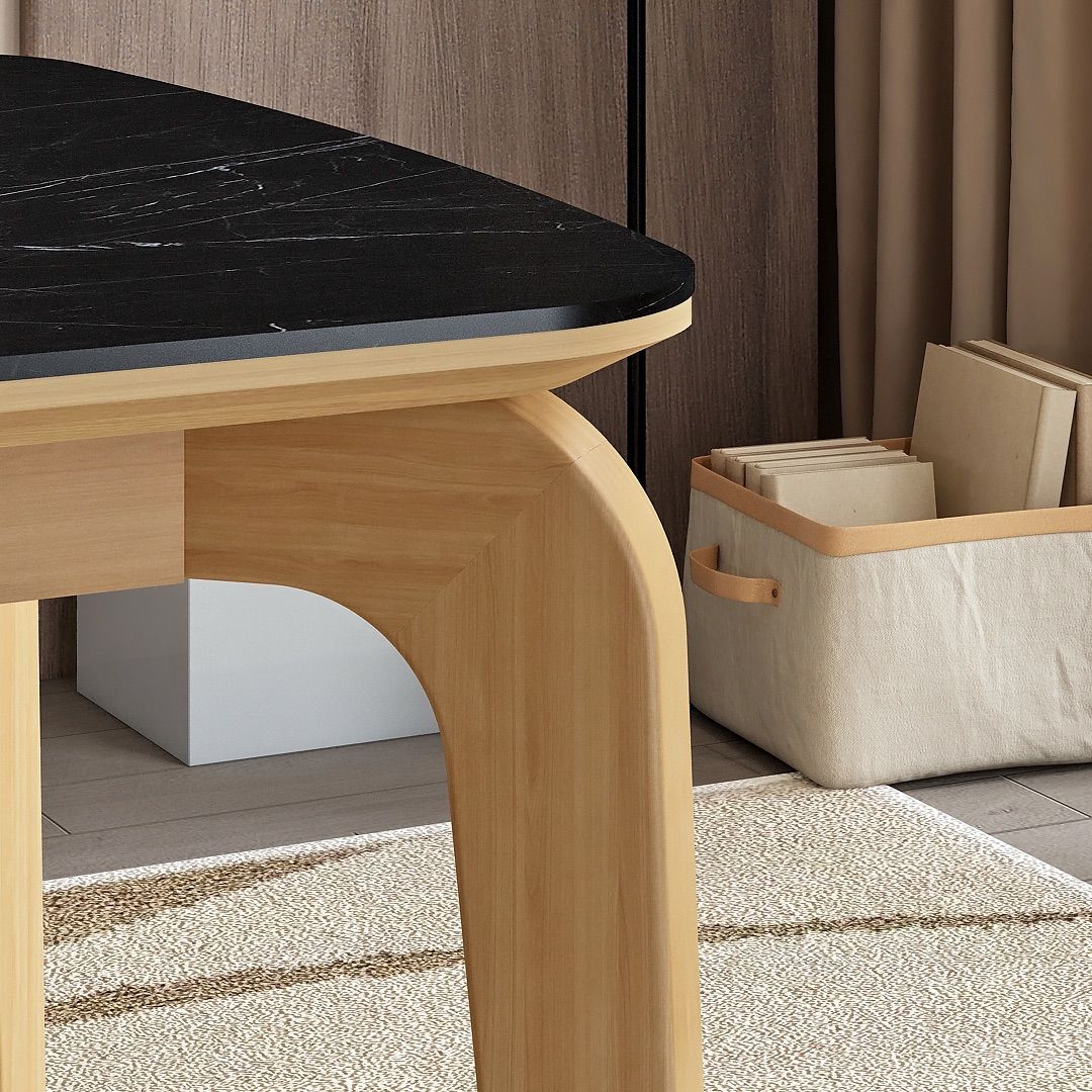 Bagian top meja menggunakan MDF finishing HPL motif Marble Hitam, memberikan kesan elegan sekaligus permukaan yang kuat dan mudah dirawat. Bagian bawah meja dilapisi PVC Sheet, menjaga kerapian finishing serta memperkuat tampilan keseluruhan desain.