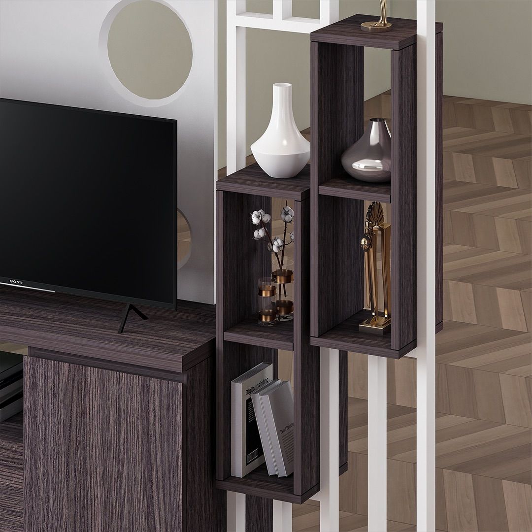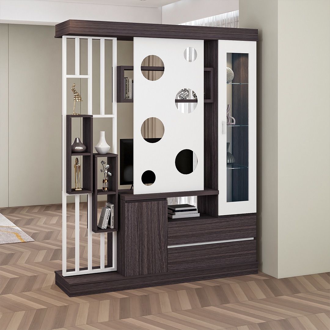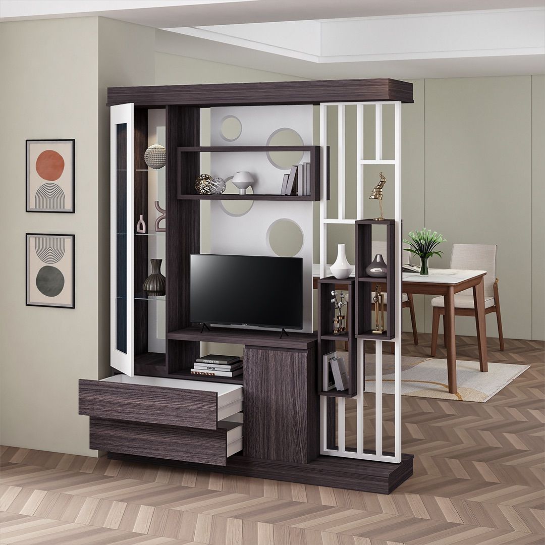 Susunan ini mendukung penyimpanan dan display yang lebih terorganisir untuk kebutuhan rumah dengan tampilan yang terstruktur dan seimbang. Pencahayaan terintegrasi memberi aksen visual yang halus, sehingga unit ini berfungsi sebagai pembatas sekaligus elemen penyimpanan media di ruang hunian.