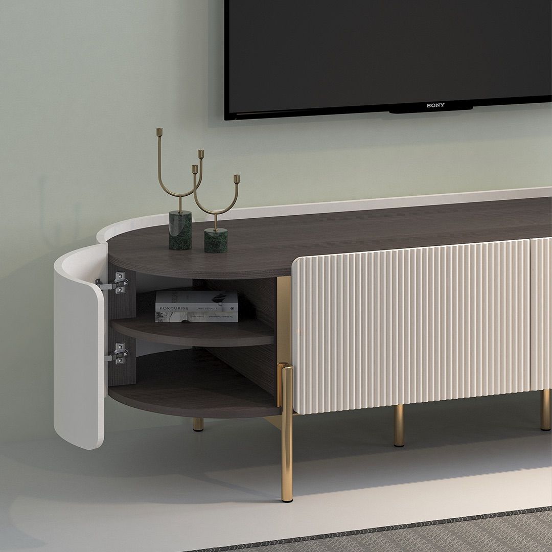Pintu diberi detail fluted dengan finishing duco warna SLV cream sebagai aksen yang halus. Kaki menggunakan pipa baja dengan finishing chrome gold, memberi sentuhan elegan tanpa mengganggu tampilan keseluruhan.