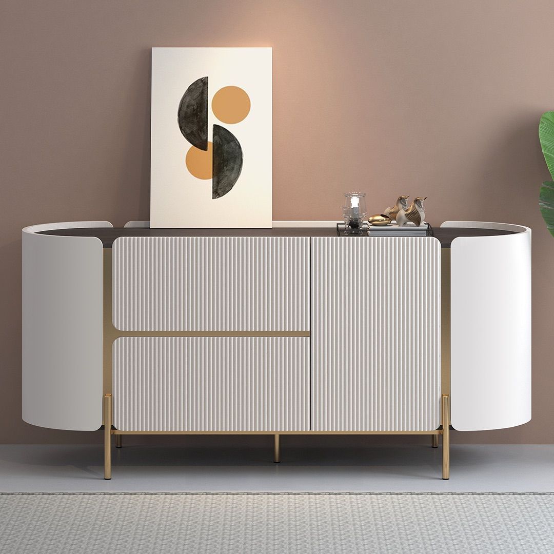 Pintu menampilkan desain fluted dengan finishing duco warna SLV cream sebagai aksen yang halus. Rangka kaki menggunakan pipa baja dengan finishing chrome gold, memberi sentuhan elegan tanpa mengganggu kesan keseluruhan.