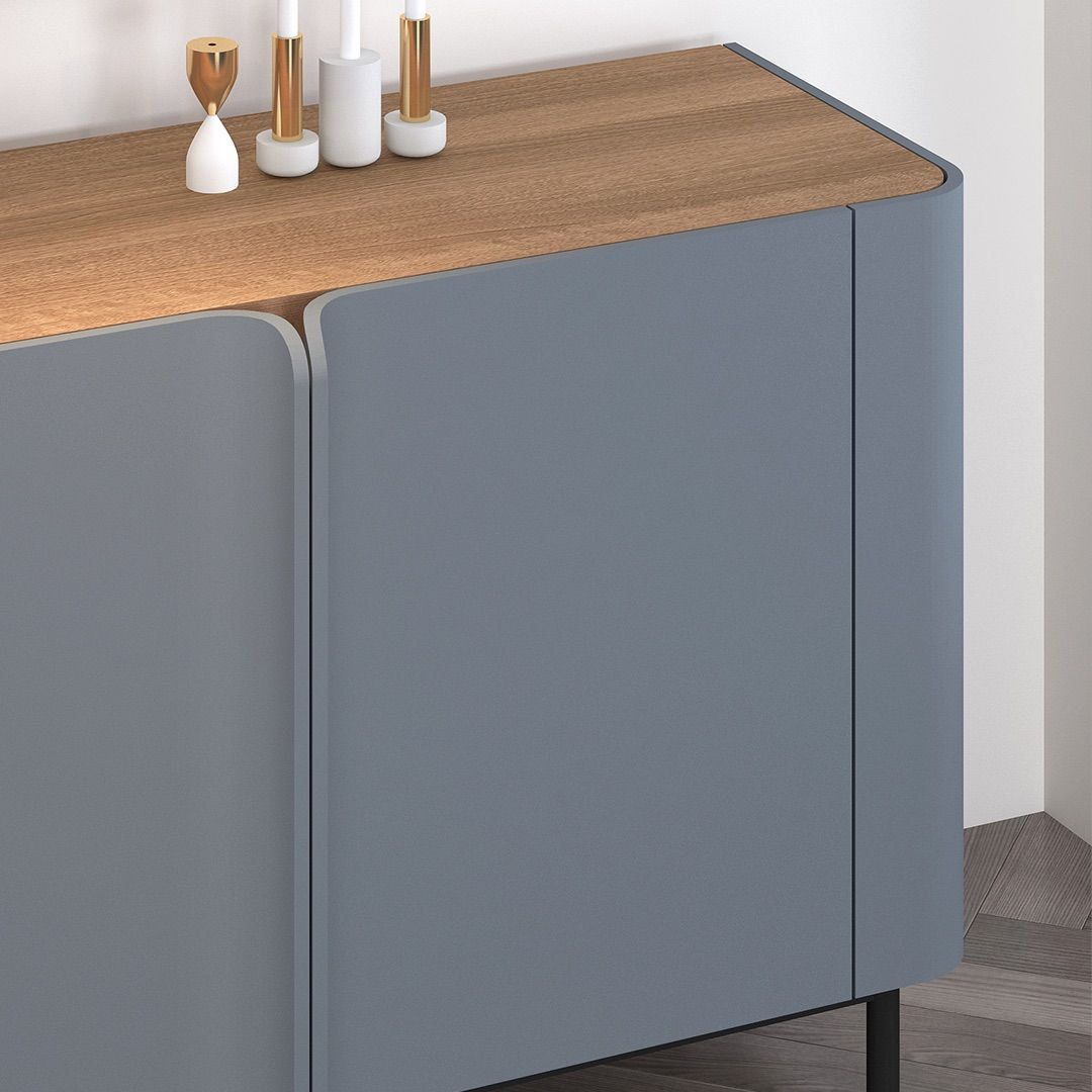 Pintu dilapisi finishing duco warna abu-abu dengan handle berbentuk rounded yang memberi kesan lembut. Kaki menggunakan pipa baja dengan finishing powder coating hitam, menjaga tampilan keseluruhan tetap bersih dan tenang.