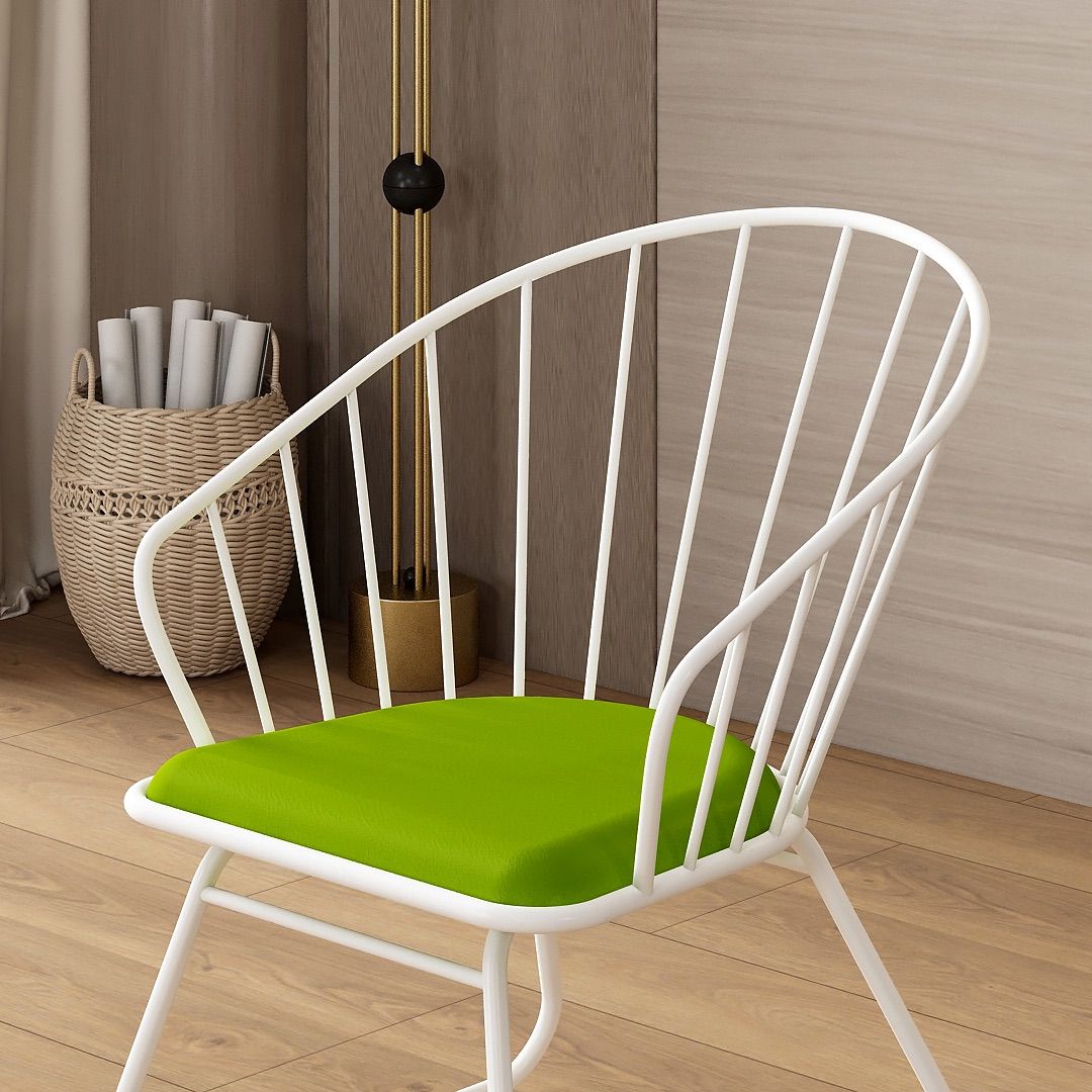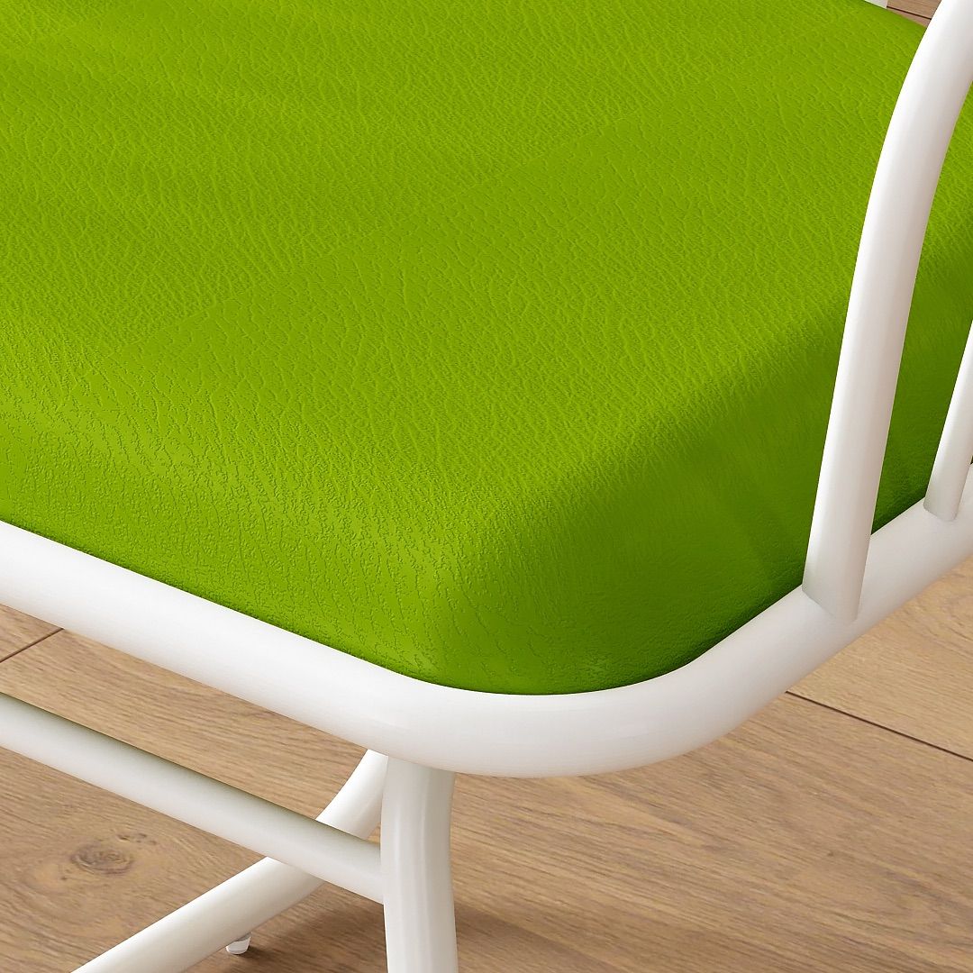 Bagian dudukan dilengkapi bantalan dari spons yang dilapisi kain Oscar warna hijau, memberikan kenyamanan sekaligus mempertahankan bentuk yang tertata. Perpaduan rangka besi dan dudukan berlapis kain Oscar menghasilkan desain kursi yang fungsional dengan komposisi material yang jelas untuk penggunaan hunian maupun area komersial ringan.