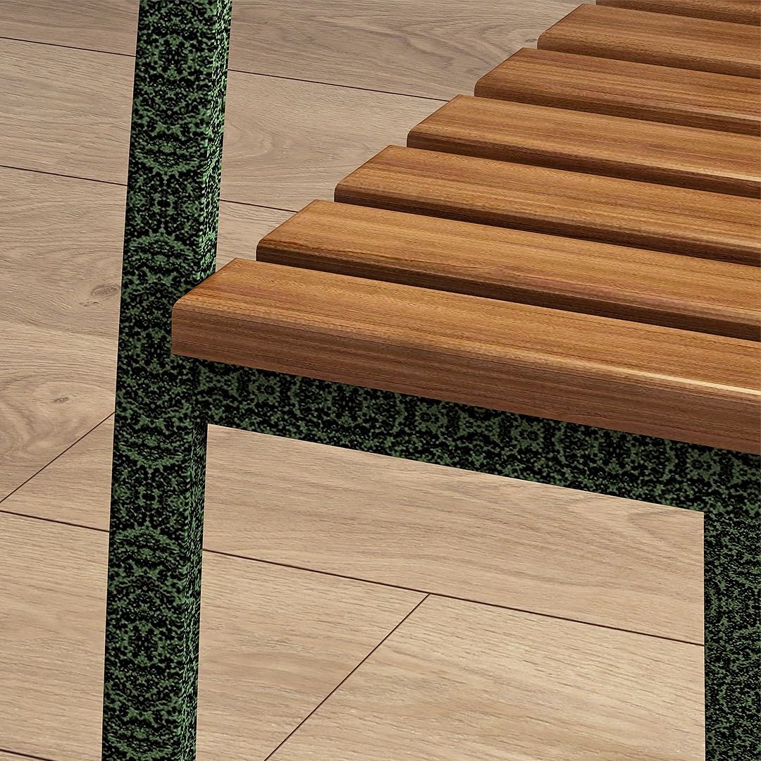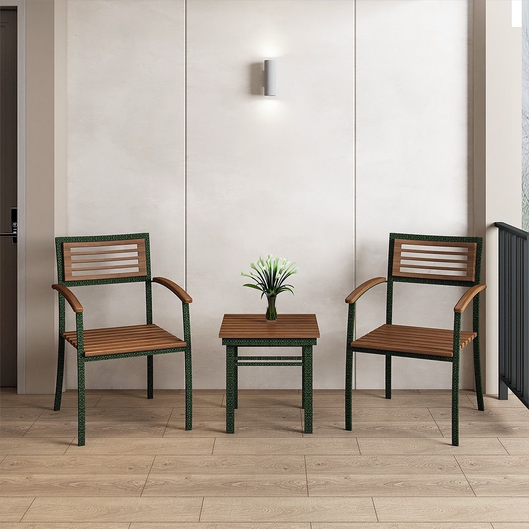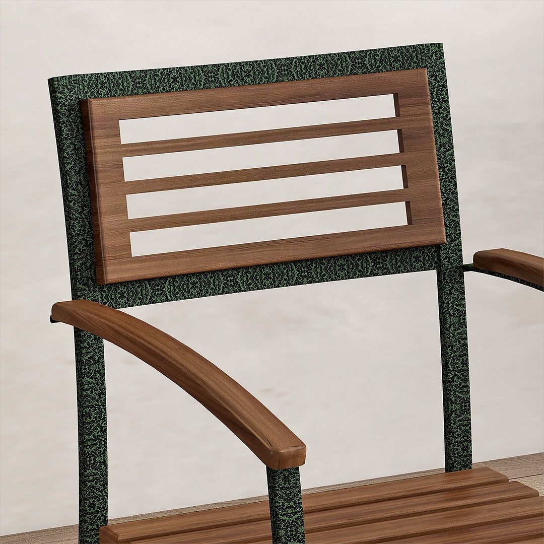 Kursi Teras KT 001 menggunakan rangka pipa besi dengan finishing powder coating warna antique green yang menghasilkan tekstur pada permukaannya. Dudukan dan sandaran dibuat dari kayu solid dengan finishing PU, membentuk perpaduan seimbang antara elemen metal dan kayu.