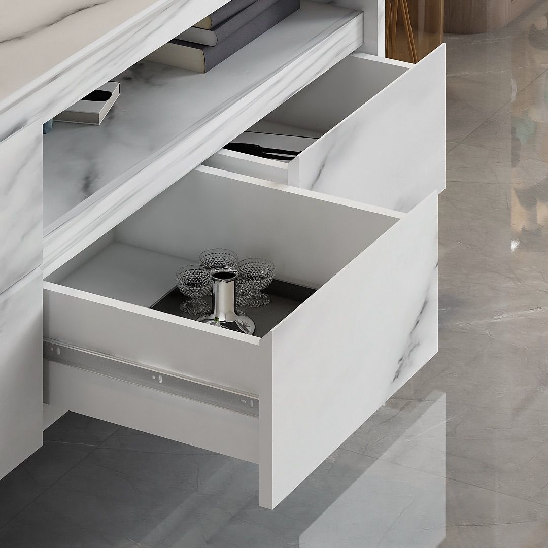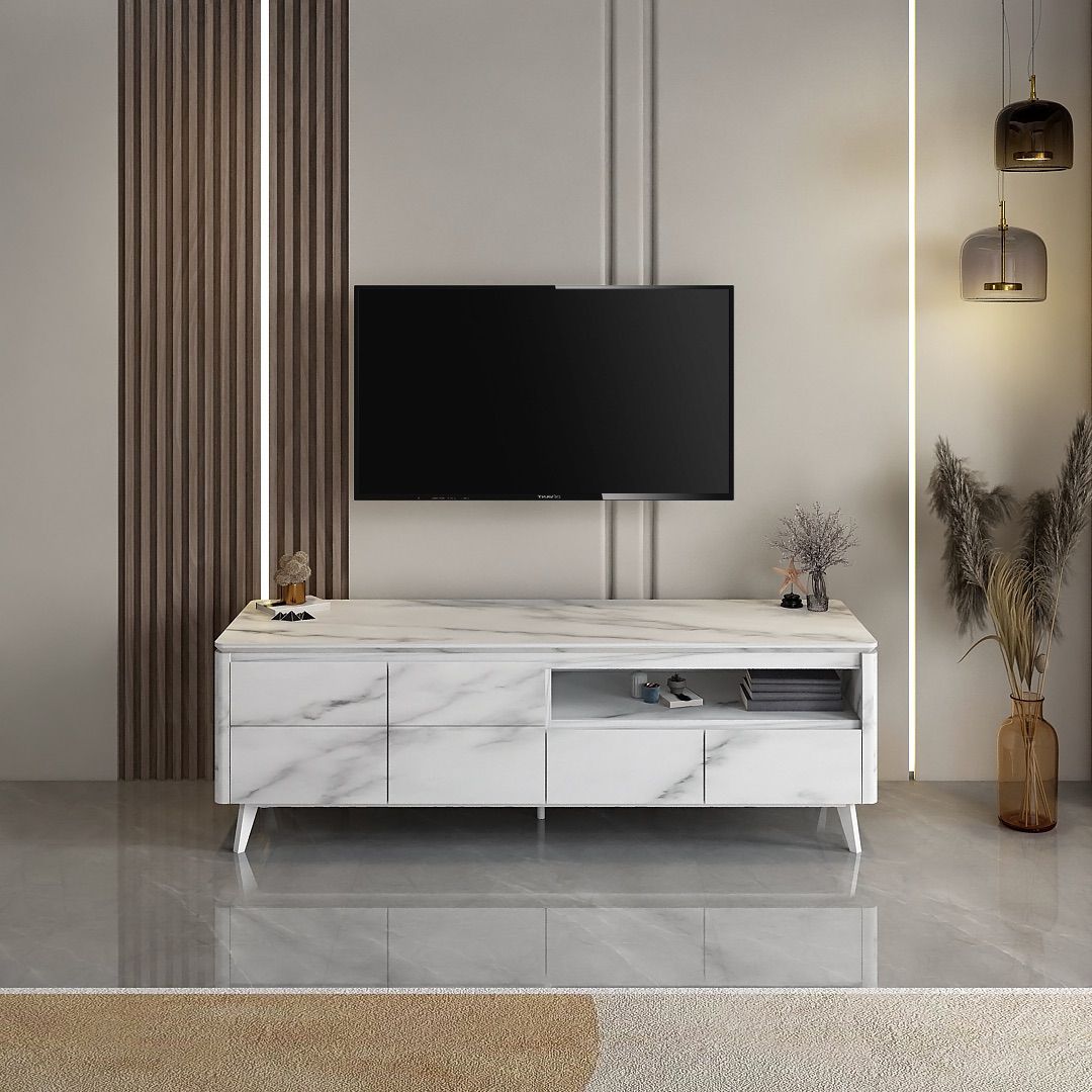 Bagian kaki menggunakan pipa besi dengan finishing powder coating warna putih yang memberikan struktur kokoh sekaligus kontras visual yang ringan. Dirancang untuk kebutuhan penyimpanan, TC Marble 160-02 dilengkapi dengan dua laci, dua pintu, serta variasi rak terbuka, sehingga fungsional untuk digunakan di ruang keluarga maupun ruang makan.