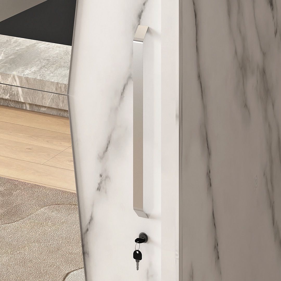 Marble 3D SL terbuat dari particle board dan MDF dengan finishing PVC motif marmer yang membentuk tampilan bagian depan. Model ini menggunakan sistem pintu sliding dengan elemen cermin pada kedua panel pintu, menciptakan komposisi visual yang menyatu dan rapi pada seluruh permukaan depan.