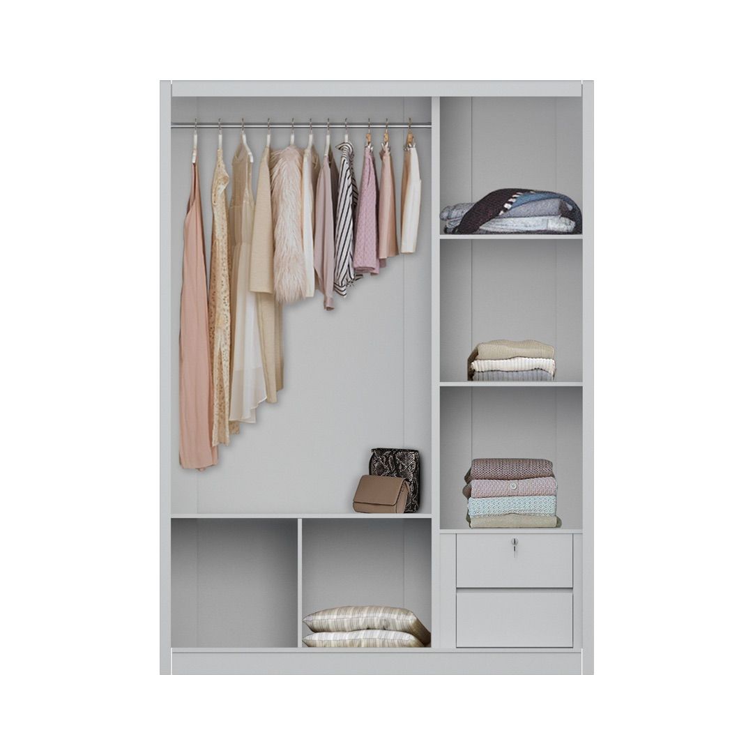 Bagian dalam lemari dilengkapi dengan satu area gantung dan dua laci internal untuk mendukung kebutuhan penyimpanan pakaian dasar. Tata letak internal memisahkan pakaian gantung dan barang berukuran kecil secara jelas dan fungsional. Struktur keseluruhan menekankan fungsi penyimpanan yang efisien dengan tampilan yang tetap terkontrol, sesuai untuk kebutuhan kamar tidur hunian.