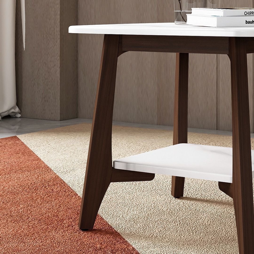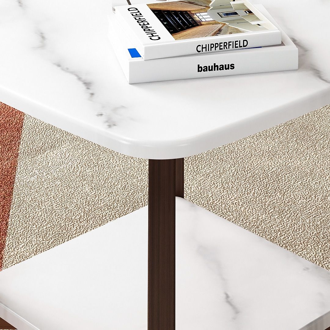 Bagian top meja serta variasi panel menggunakan MDF berfinishing PVC sheet motif Marble, menghadirkan kontras visual yang rapi terhadap rangka kayu. Perpaduan material kayu solid dan permukaan bermotif marble menghasilkan desain meja yang tertata dengan komposisi material yang jelas, sesuai untuk penggunaan hunian maupun area komersial ringan.