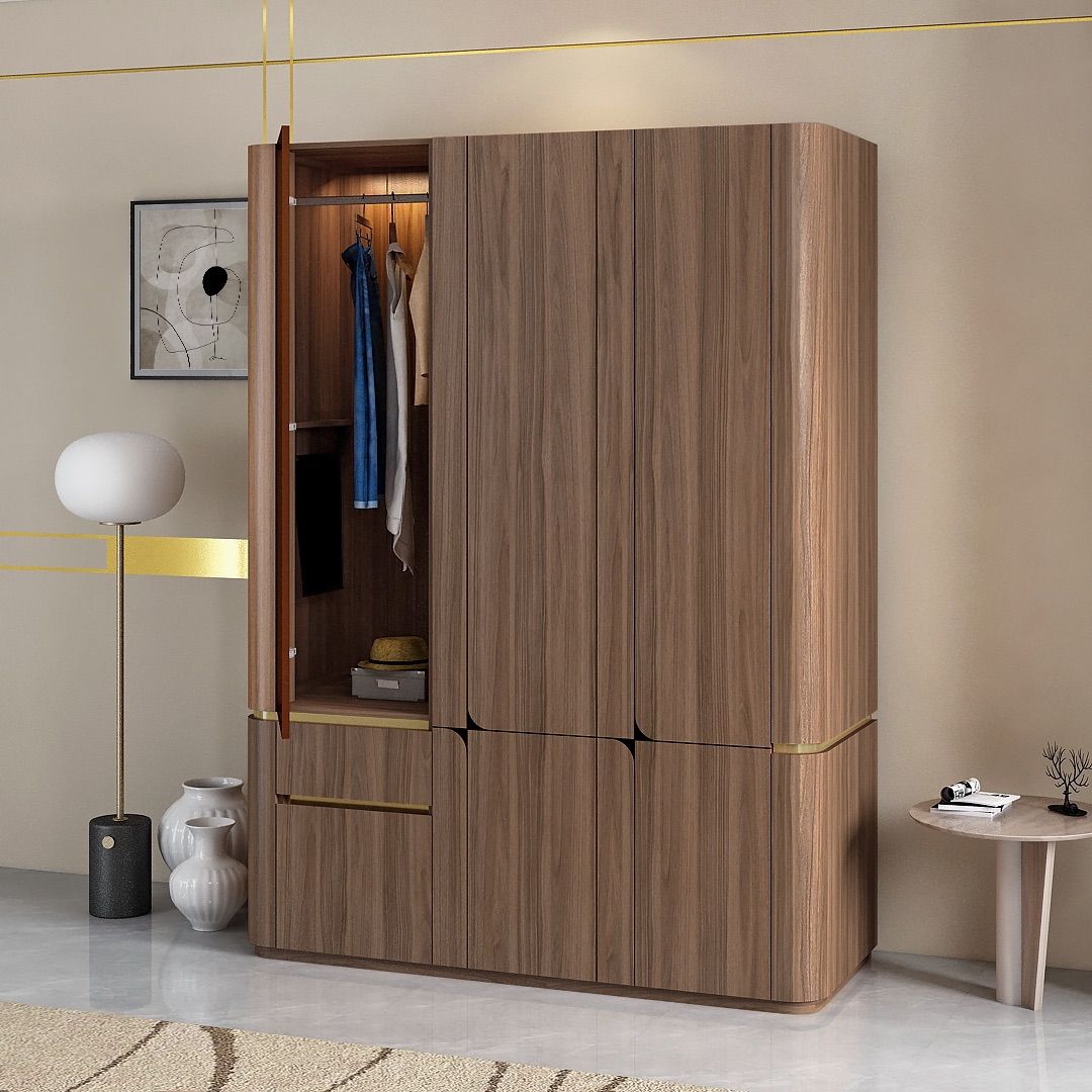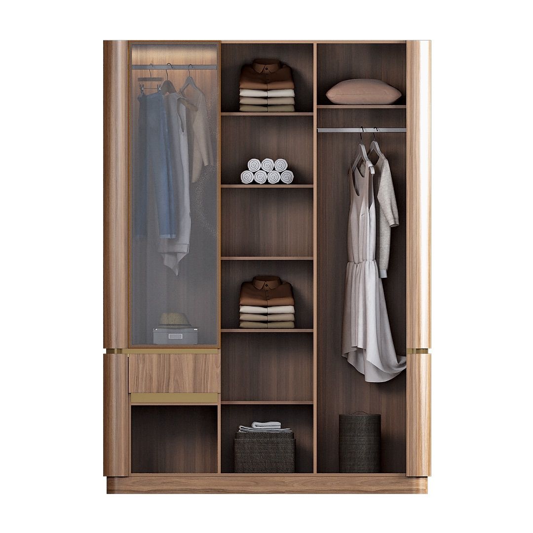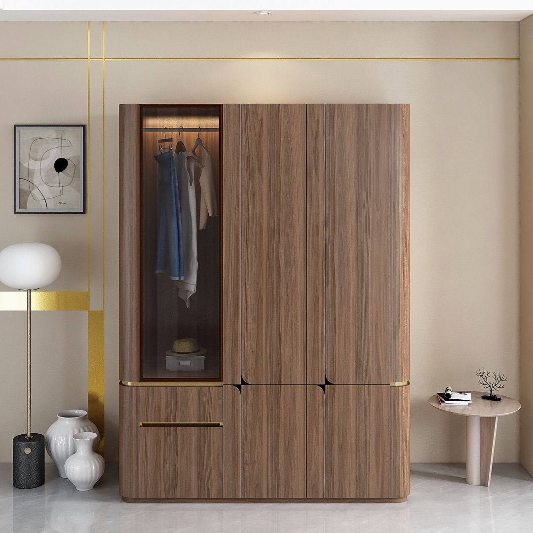 Model ini memiliki satu pintu kaca dengan frame aluminium berwarna key brown sebagai elemen pembeda yang menambah kontras visual pada keseluruhan desain. Bagian dalam lemari dilengkapi dengan area gantung dan laci untuk mendukung penyimpanan pakaian yang terorganisir. Sudut luar lemari dirancang dengan bentuk membulat, memberikan karakter yang berbeda dan tetap sesuai untuk kebutuhan kamar tidur hunian.