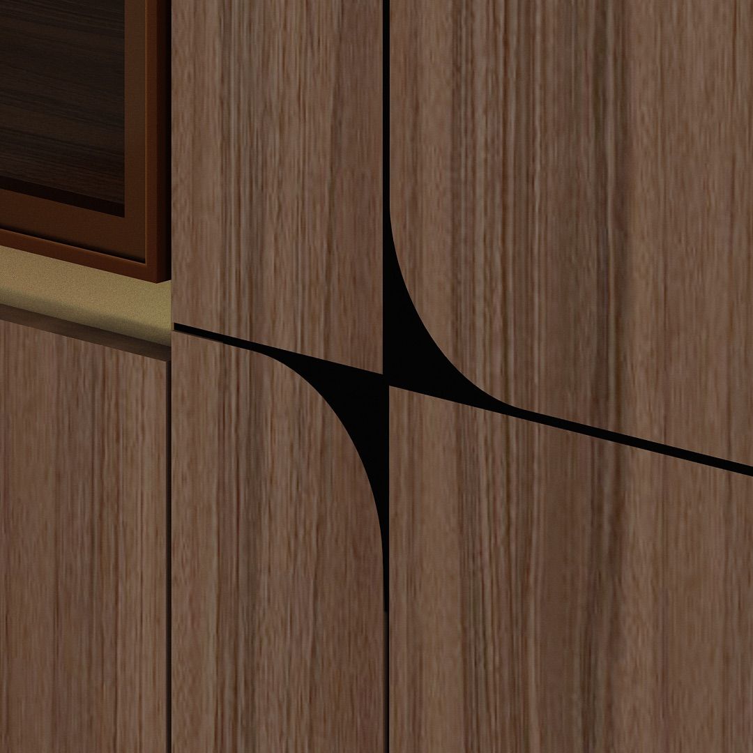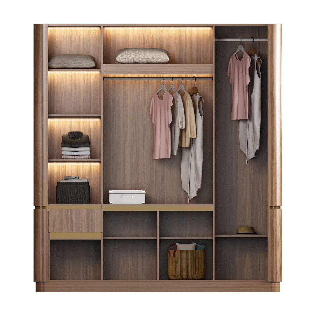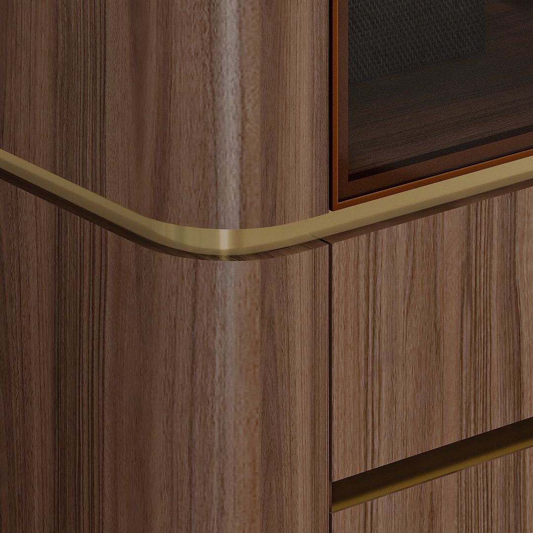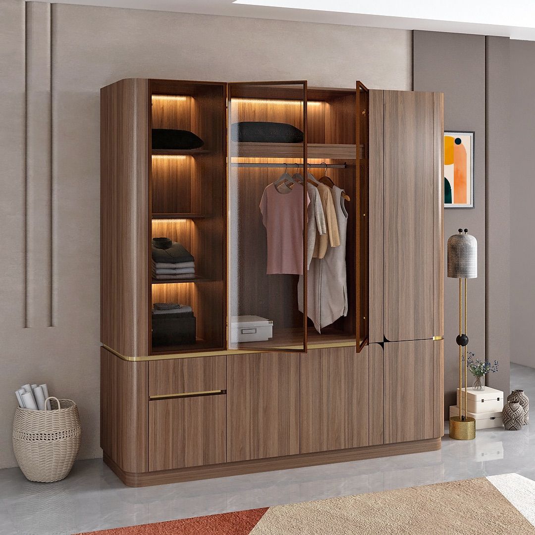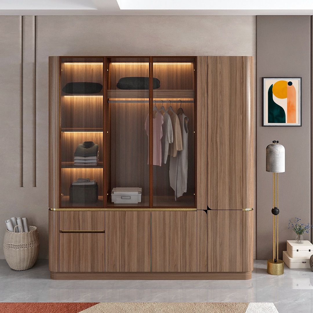 Model ini dilengkapi dengan panel pintu kaca berbingkai aluminium warna key brown sebagai aksen visual yang memberi kontras pada desain keseluruhan. Bagian dalam lemari menyediakan area gantung dan laci untuk mendukung penyimpanan pakaian yang terorganisir. Sudut luar lemari dirancang dengan bentuk membulat, memberikan karakter yang berbeda dan tetap sesuai untuk kebutuhan kamar tidur hunian.