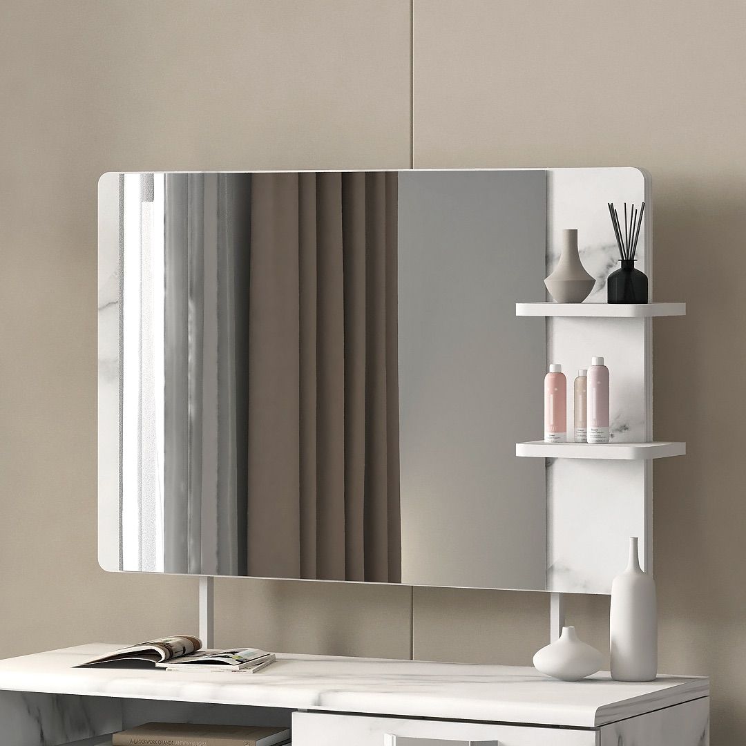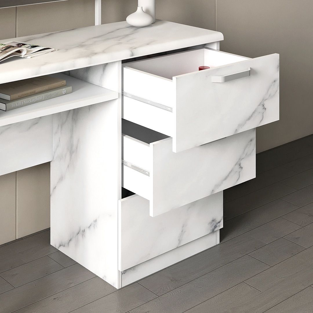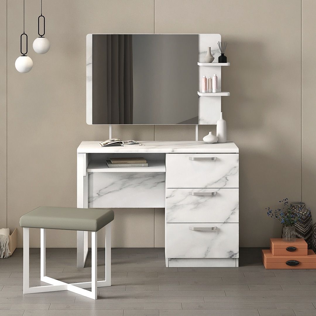 Meja Rias Marble 01 terbuat dari MDF dan particle board dengan finishing PVC Sheet motif Marble, menghadirkan tampilan yang bersih dan elegan untuk penggunaan sehari-hari.
