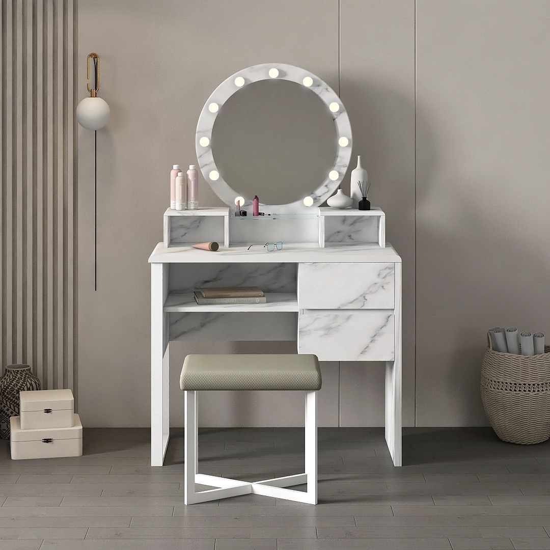 Meja Rias Marble 02 terbuat dari MDF dan Particle Board dengan finishing PVC Sheet motif Marble, menghadirkan tampilan yang bersih dan elegan.