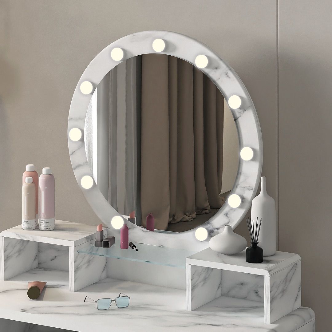 Meja rias ini dilengkapi dengan kaca cermin yang menggunakan lampu LED, memberikan pencahayaan yang fungsional sekaligus mendukung aktivitas berdandan sehari-hari.