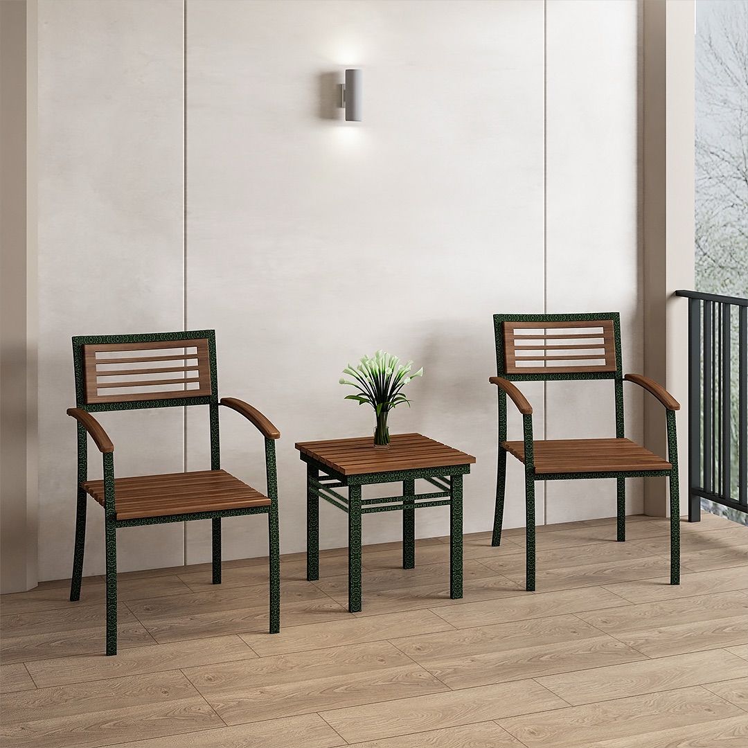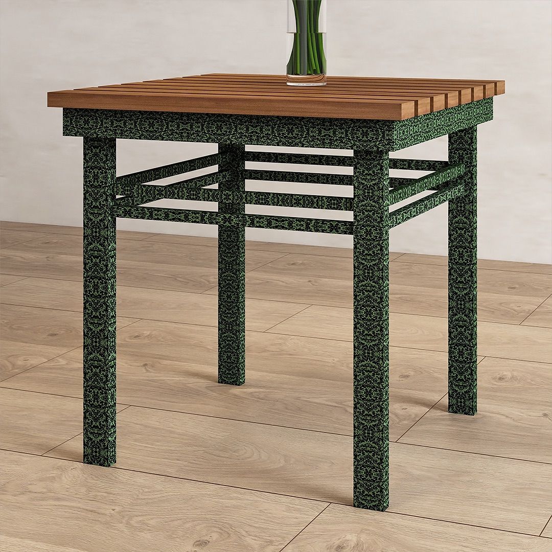 Meja Teras MT 001 menggunakan rangka pipa besi dengan finishing powder coating warna antique green yang memberi karakter tekstur pada strukturnya. Bagian top dibuat dari kayu solid dengan finishing PU, menjaga konsistensi kombinasi materialnya.