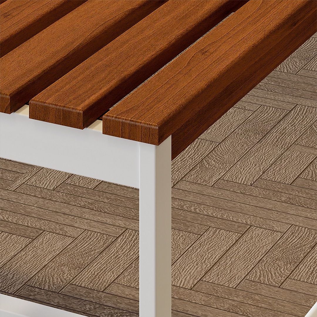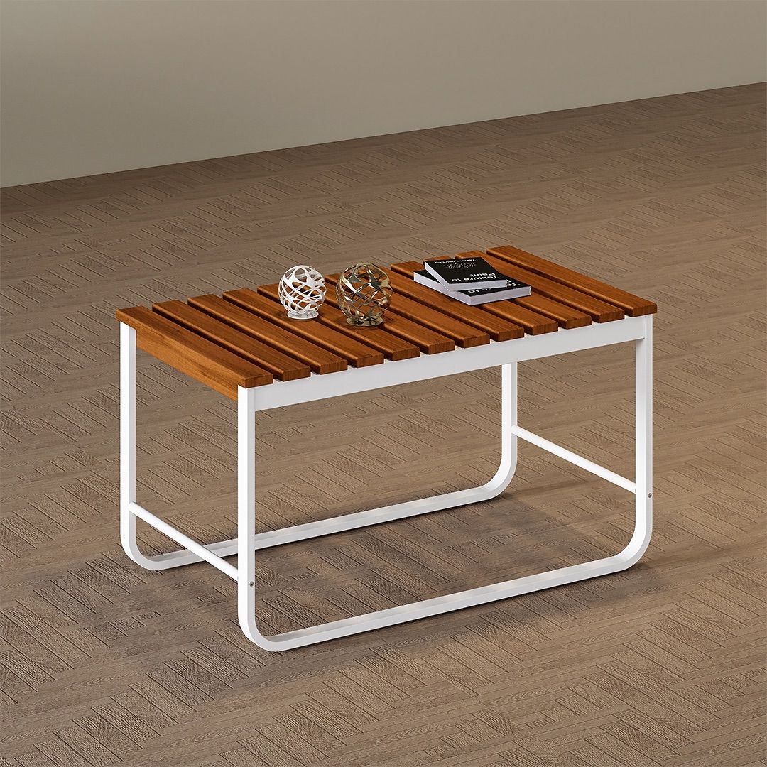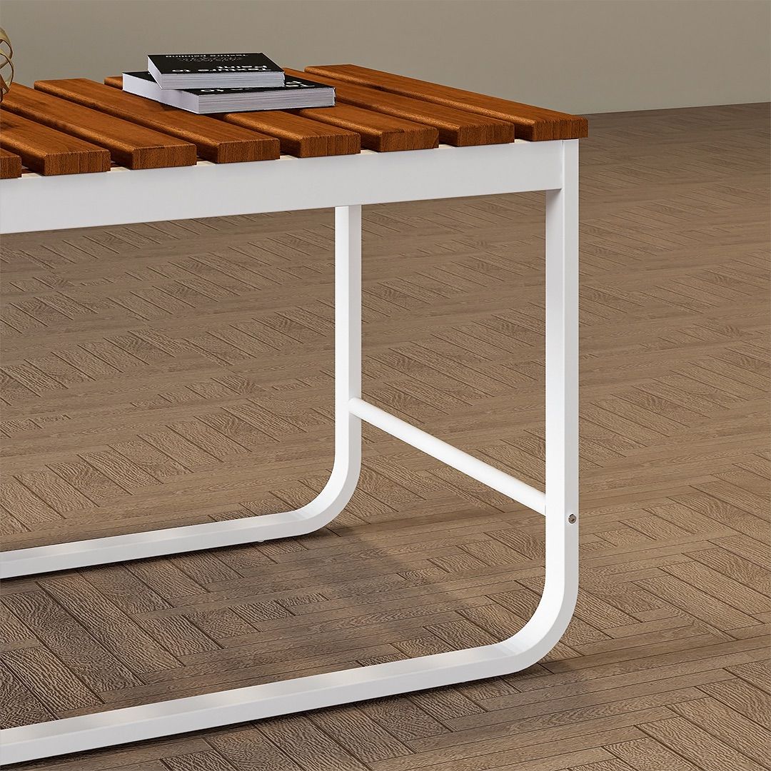 Bagian top meja terbuat dari kayu solid dengan finishing PU yang memberikan perlindungan permukaan untuk penggunaan sehari-hari. Meja ini cocok digunakan di area teras tertutup atau semi-outdoor yang terlindung dan tidak boleh terkena hujan langsung.