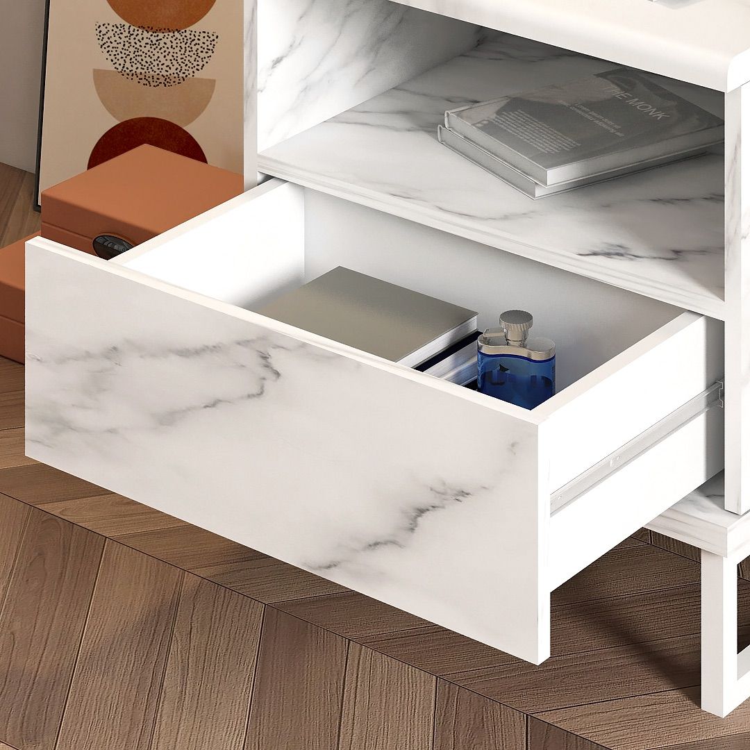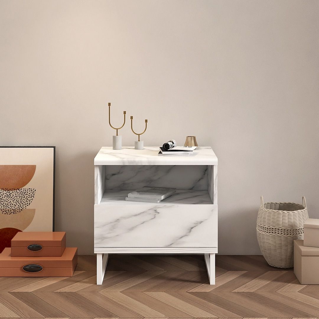 Bagian kaki menggunakan pipa besi dengan finishing powder coating warna putih, memberikan penopang yang stabil sekaligus kontras visual yang ringan terhadap bodi bermotif marble. Perpaduan material panel dan rangka besi menghasilkan desain nakas yang fungsional untuk penggunaan kamar tidur hunian.