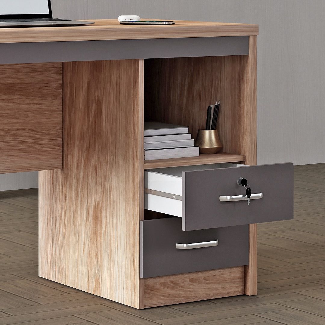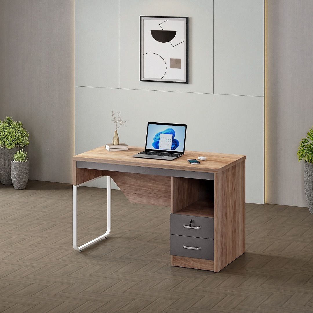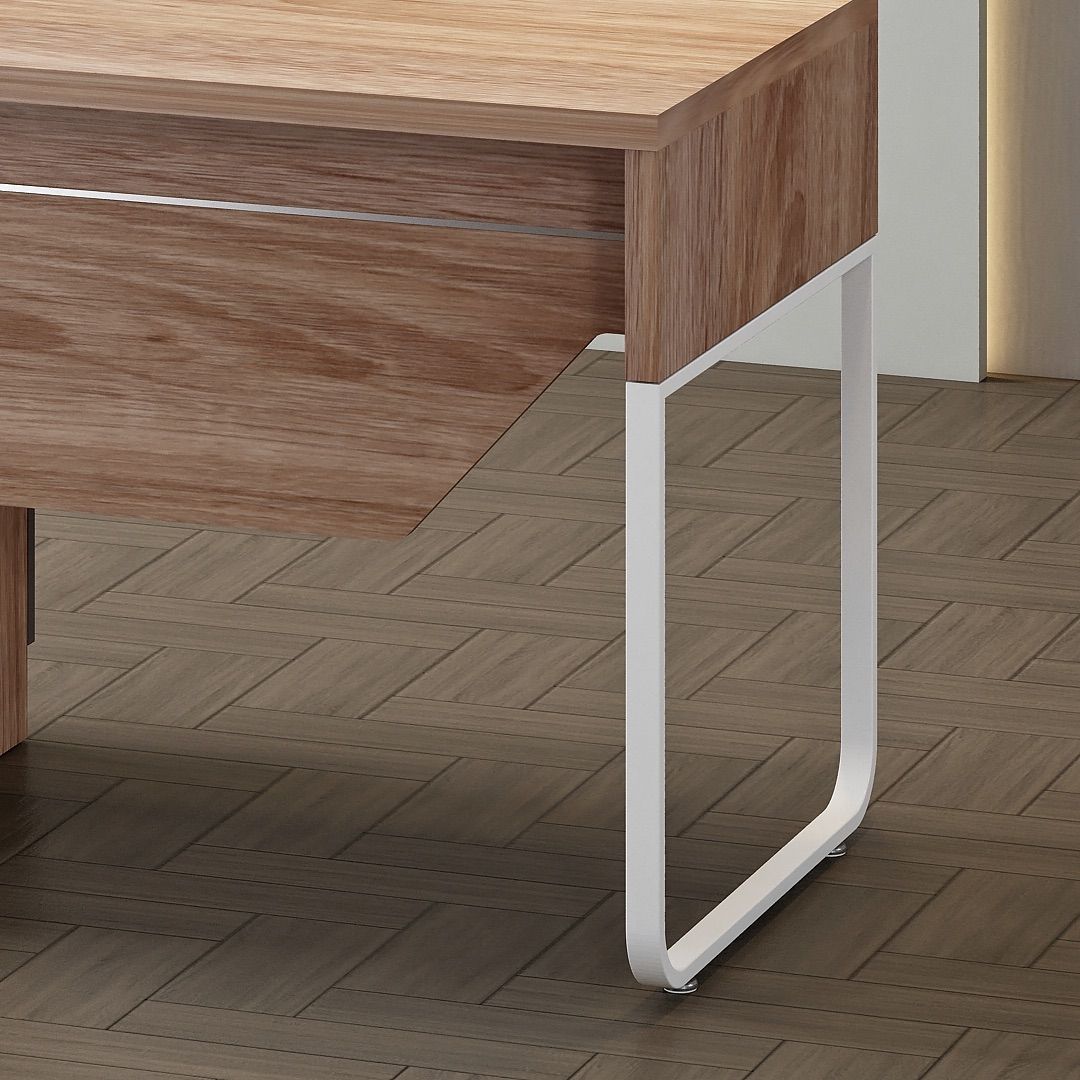 Kaki meja menggunakan pipa besi dengan finishing powder coating putih, memberikan struktur yang stabil dan bersih. Body pedestal dilengkapi dua laci yang mendukung fungsi penyimpanan tanpa mengganggu tampilan keseluruhan meja.