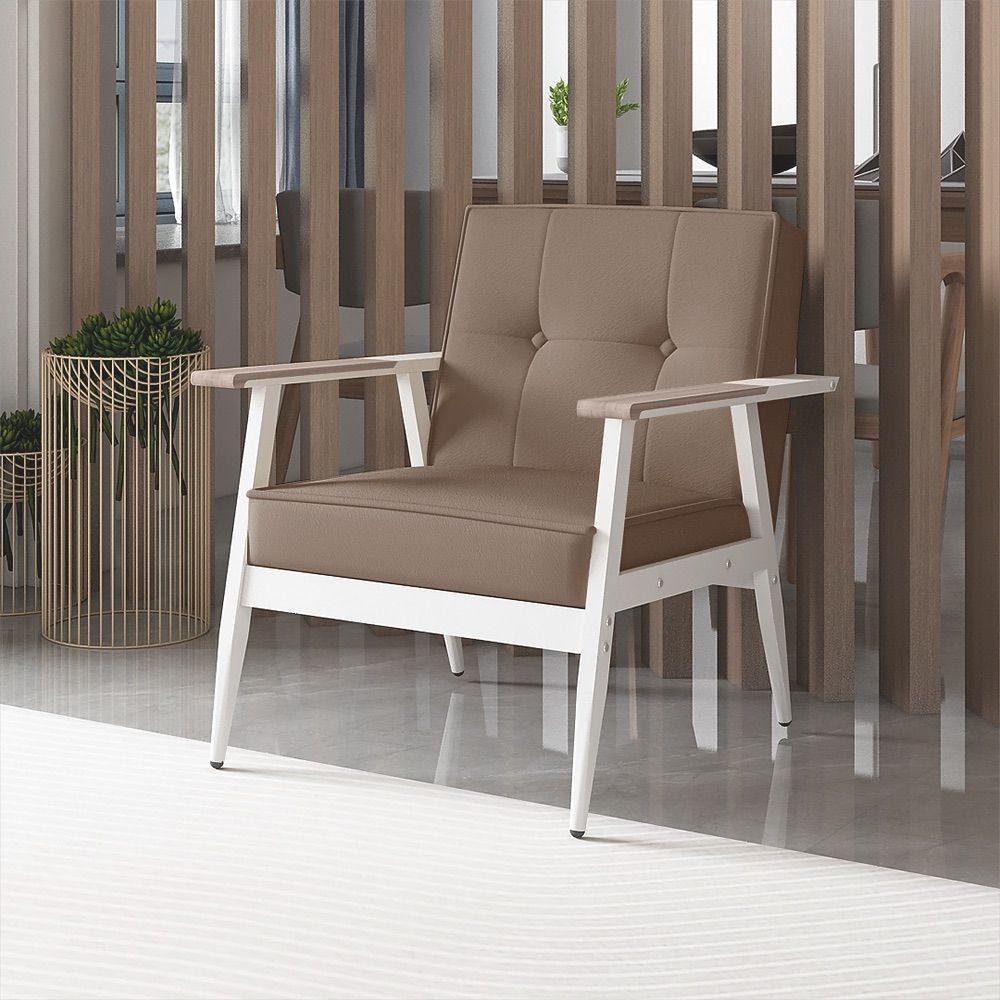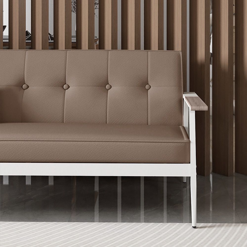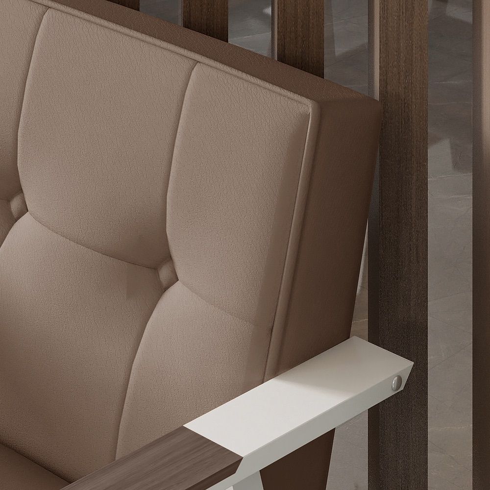 Rangka sofa terbuat dari pipa besi dengan finishing powder coating, tersedia dalam pilihan warna Hitam dan Putih, menghasilkan struktur yang kokoh dengan tampilan modern dan rapi. Pada bagian sandaran tangan terdapat variasi MDF dengan finishing PVC, menambahkan detail permukaan sekaligus kontras visual terhadap rangka besi.