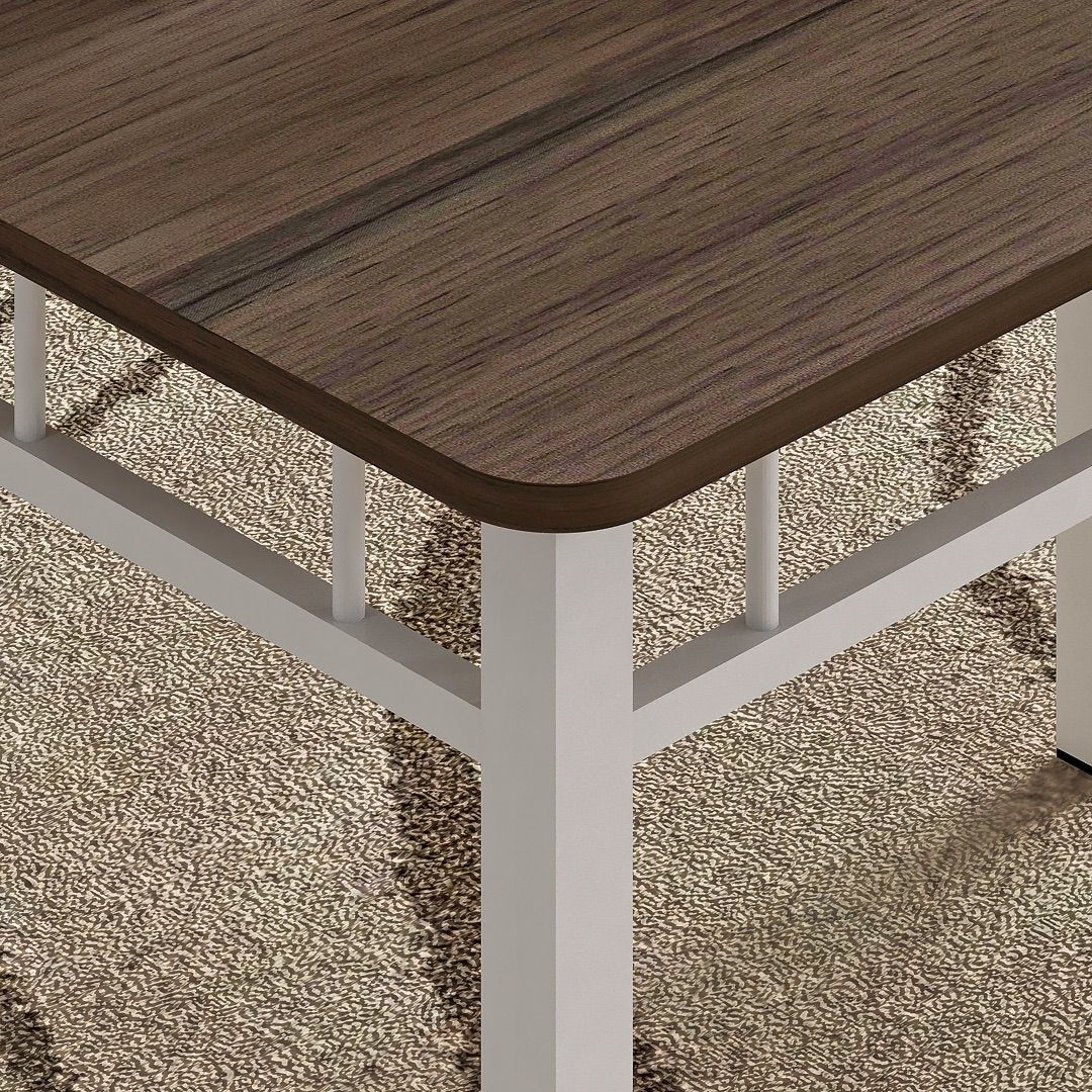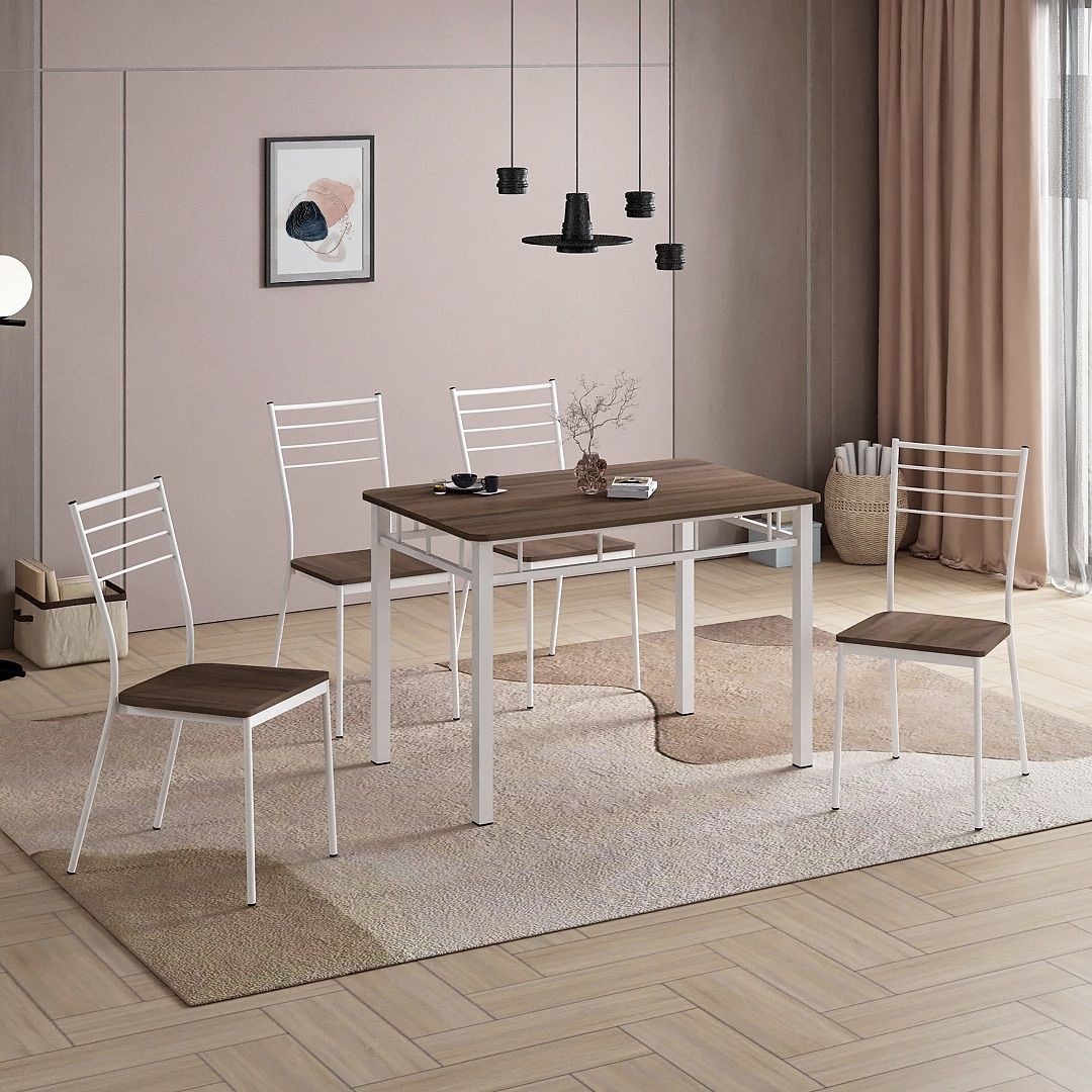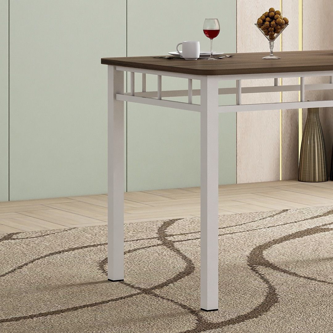 Meja Makan STM 002 dibuat dengan rangka pipa baja yang dilapisi finishing powder coating putih, membentuk struktur yang kokoh dan rapi. Permukaan meja terbuat dari MDF dengan finishing PVC sheet Grasse Grey Oak, menghadirkan permukaan yang bersih dengan tekstur kayu yang halus.