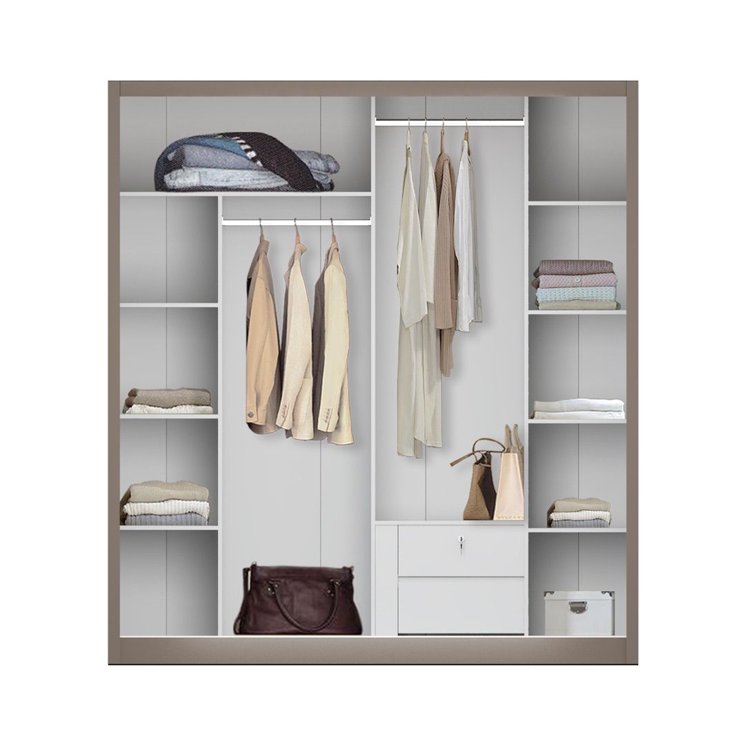 Lemari ini menggunakan sistem pintu sliding yang praktis dan efisien untuk penggunaan ruang. Pada bagian dalam, Volare 4D SL dilengkapi dengan dua gantungan baju yang membantu penataan pakaian tetap terorganisir dan mudah diakses untuk kebutuhan sehari-hari.